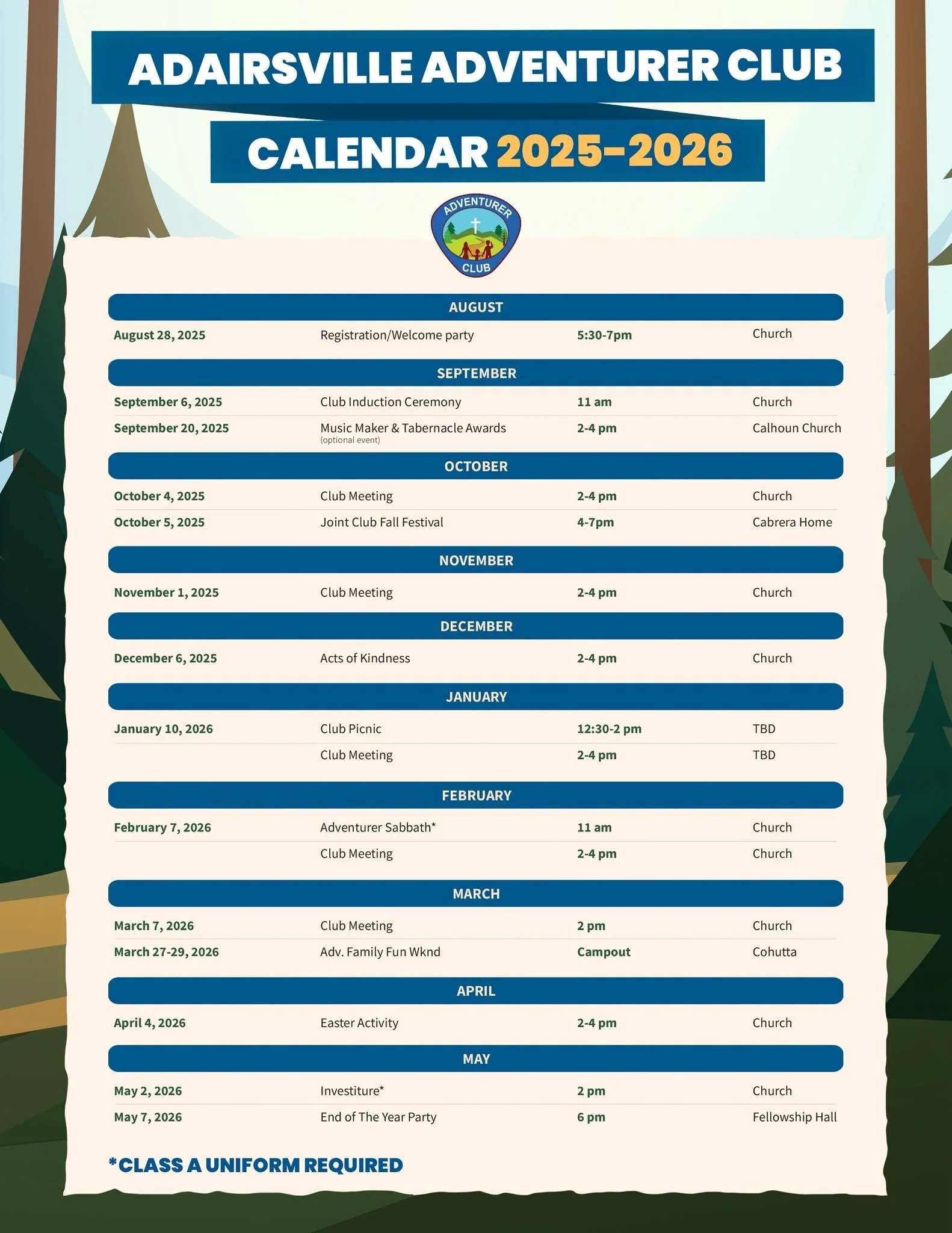 The Adventurer Club is a Seventh-day Adventist Church-sponsored ministry open to all families of children in grades Pre-K - 4th who agree to keep the Adventurer Pledge and Law.